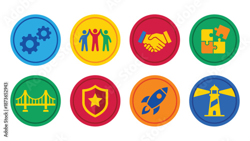 Corporate Strategy & Teamwork Icons: Collaboration, Innovation, Security & Guidance Vector Set
