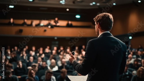 Corporate training session with data visualizations. The lecturer finishes the speech, and the audience is applauding and raising their hands.