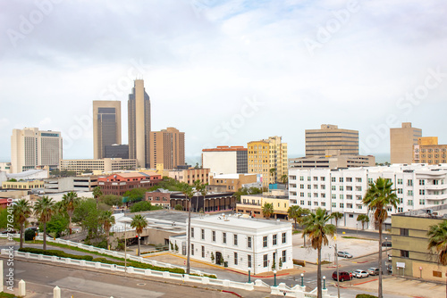 Corpus Christi, Texas - March 15, 2020: Downtown Corpus Christi skyline buildings along the Gulf Of Mexico. Taken in Corpus Christi Texas on a cloudy overcast day