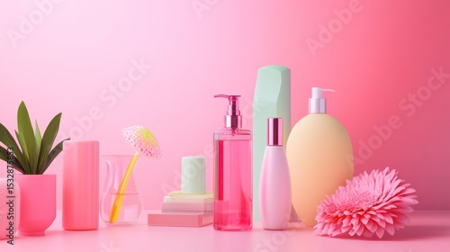 Cosmetic products on pink background skin care packaging feminine fresh style beauty hygiene plastic bottles