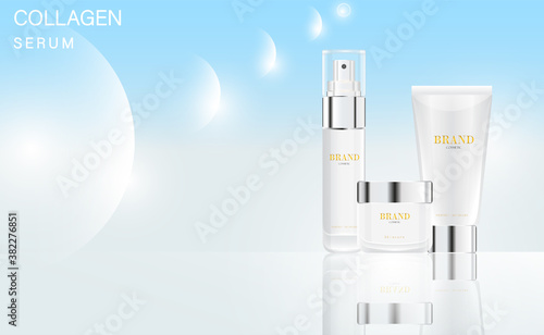 Cosmetic skincare set ads with strong sunbeam and clear white wall background in 3d illustration