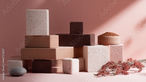Cosmetic soap bars stacked pink background natural skincare organic product concept