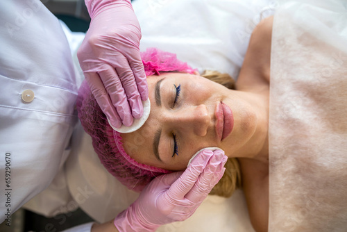 cosmetologist cleans a woman's face with a cotton pad or sponge.