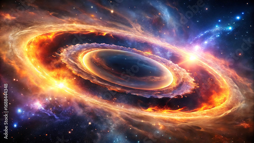 Cosmic fire rings colliding in endless deep space glowing galactic abstract background with dramatic stardust energy