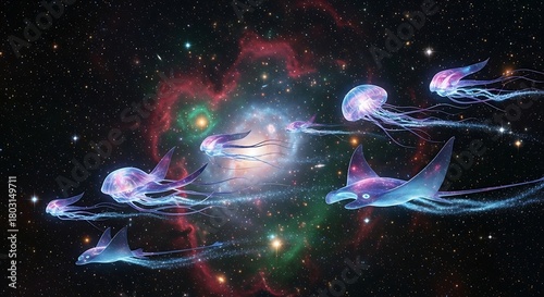 Cosmic Jellyfish and Manta Rays Swimming Through a Starry Nebula Galaxy.