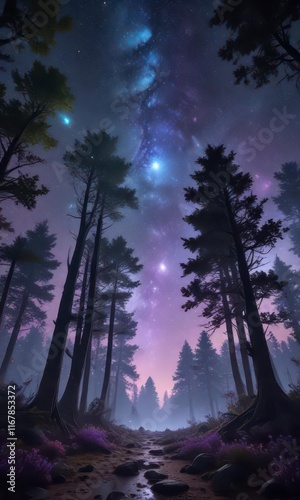 Cosmic landscape with holographic trees and starry sky, holographic forest, surreal, interstellar