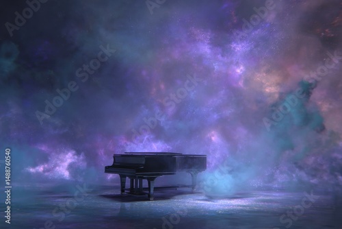 Cosmic piano in a dreamy, ethereal setting.