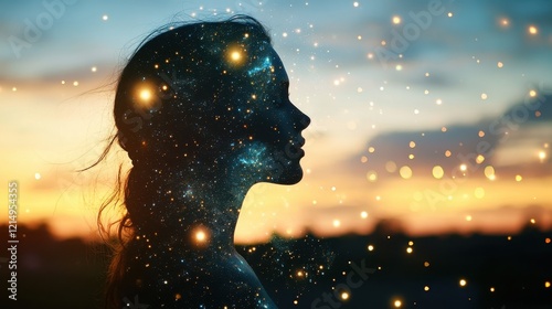 Cosmic Silhouette: A Woman's Profile Adorned with Stars at Sunset