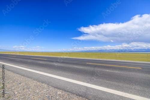 Country road and green grassland nature landscape under blue sky. Road trip.