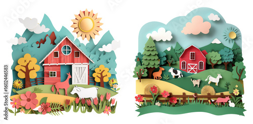 Countryside farm scene with barn and animals isolated on transparent PNG image perfect for rural-themed children’s illustrations