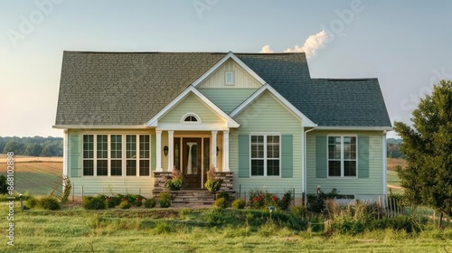 countryside home with sage green Bahama shutters, surrounded by rolling fields