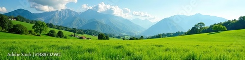 Countryside landscape with lush green field and majestic mountains in the background, isolated, mountains