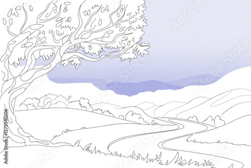 Countryside line art landscape with winding road hills and large tree under pastel sky illustration