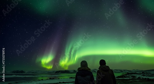 Couple admiring vibrant aurora borealis display in a dark sky with stars