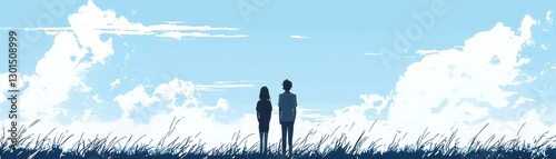 Couple contemplating cloudscape field