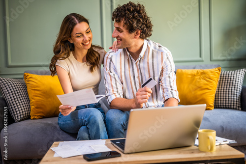 Couple discussing home finance while checking bills. They are checking financial documents and calculating family budget in living room.
