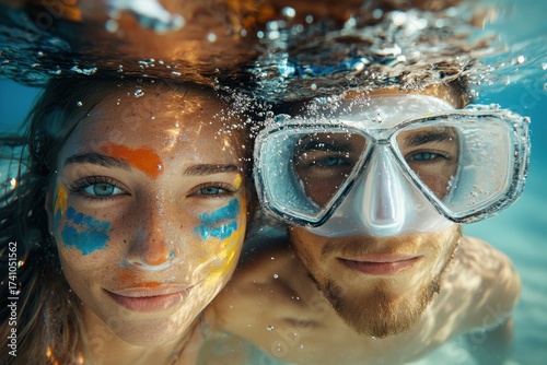 Couple enjoying underwater snorkeling with colorful face paint in clear blue water