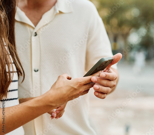 Couple enjoys a sunny day walking together in a charming urban area during late afternoon or tourists visiting a destination looking at phone map app