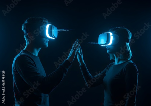 Couple in love communicates using a virtual reality headset. Image with glitch effect