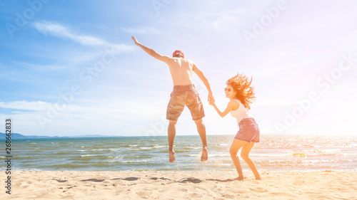 Couple is Jumping in beach