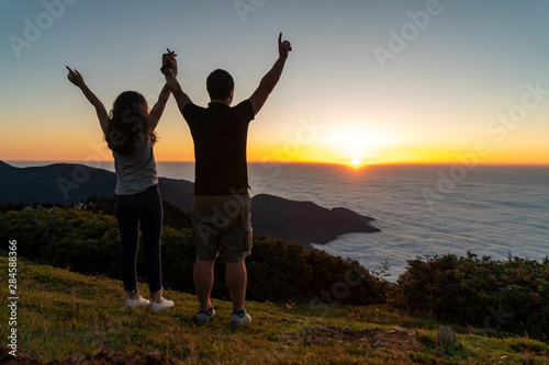 Couple looking at the beautiful sunset from Gomismta mountain, Georgia.