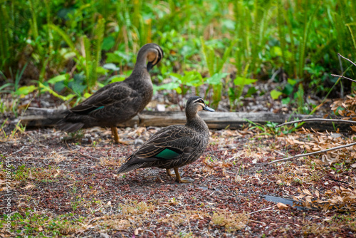 Couple of Australian Pacific Black Ducks standing on red gravel with green background