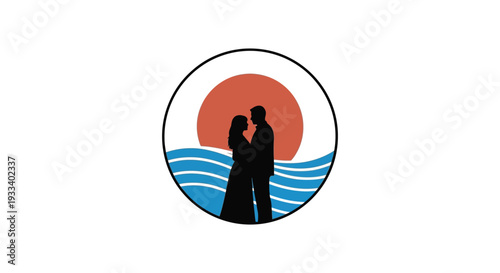 Couple Silhouette in Romantic Pose with Sunset and Ocean Waves in Circular Frame for Logo Design