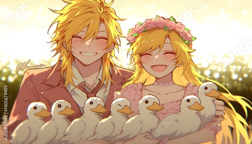 Couple with Ducks, Smiling, Garden
