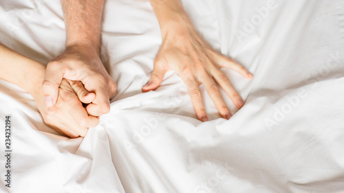 couples hold hands together in bed close-up touching each other on a white blanket.