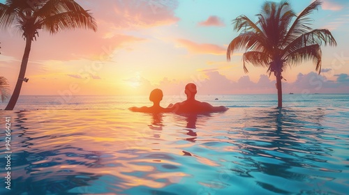Couples Relaxing Near Swimming Pool at Sunset in Luxury Hotel: Banner Background with Copyspace for Beach Holidays