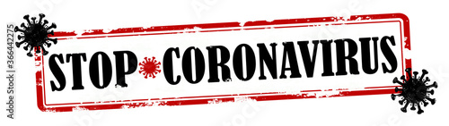 COVID-19 background banner - Red / black grunge scratched stamp sticker, with the words: " STOP CORONAVIRUS " and cartoon virus symbol, isolated on white background