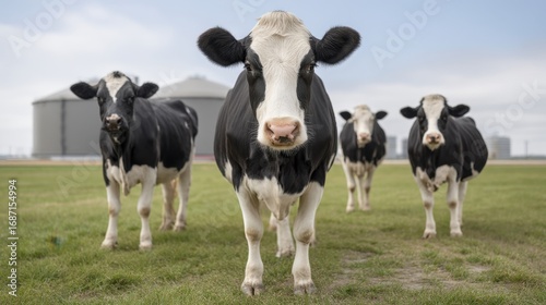 Cow Group Standing on Green Grass with Blue Sky and Silos in Background, Farm Life Scene Featuring Dairy Cattle in Agricultural Setting