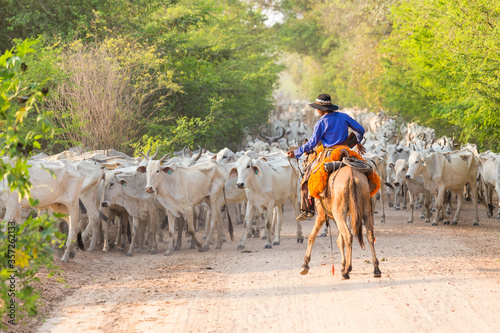 cowboys rush cattle, Gauchos from South America, cows run on a beaten path to the pasture