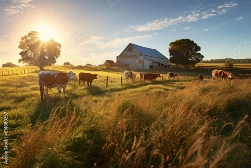 cows and goats graze next to the farm on a sunny day. Generative AI