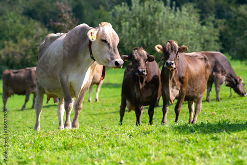 Cows are grazing on a summer day on a meadow in Switzerland. Cows grazing on farmland. Cattle pasture in a green field. Cows in a field on a eco Cattle farm. Herd of cows.