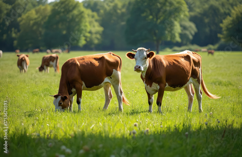 Cows graze on green meadow in rural area. Cattle herd eats grass on field. Livestock mammals farm at countryside. Farming landscape with animals on pasture.