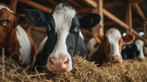 Cows grazing on hay in a rustic barn, a serene pastoral moment of rural tranquility.