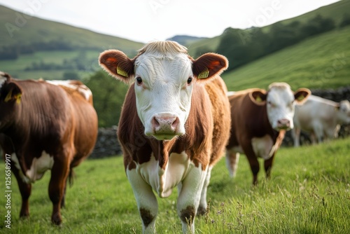Cows grazing peacefully on a lush green pasture during a sunny summer afternoon