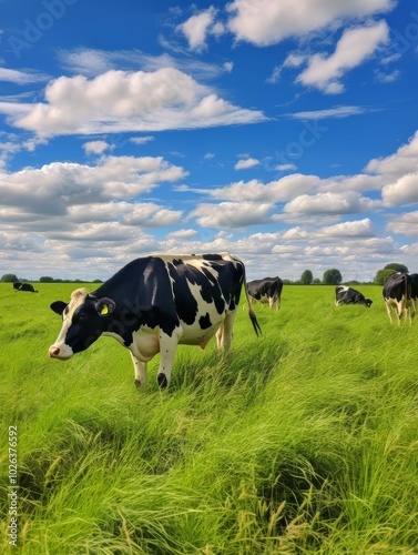 Cows grazing peacefully under a vibrant blue sky in a lush green field