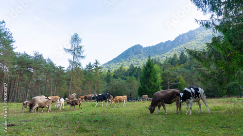 Cows of Brown Swiss Braunvieh and Holstein breeds nibble on grass of the flowering meadows of coniferous forests in the Alps mountains in Italy on a bright summer day.