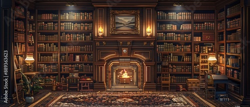Cozy 3D Rendered Pixel Art Home Library with Wooden Shelves and Warm Ambiance