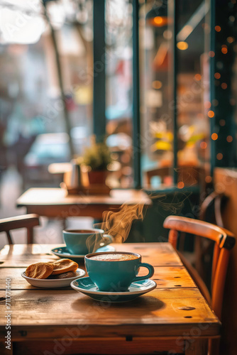 Cozy ambiance of a coffee shop, emphasizing the warmth, comfort, and details like steaming coffee cups, pastries, and inviting seating areas