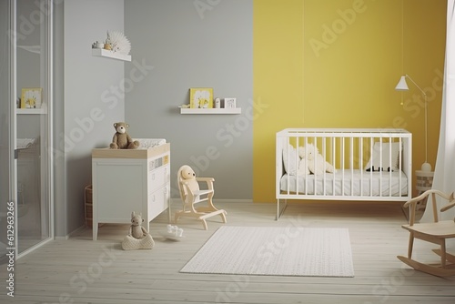 cozy and bright nursery with a white crib and yellow walls. Generative AI