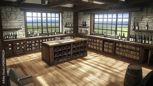Cozy and Inviting Wine Cellar with Rustic Wooden Interiors and Abundant Natural Light Overlooking Scenic Landscape