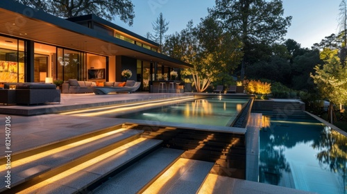 Cozy and relaxing atmosphere in the pool area during a sunset. generative ai