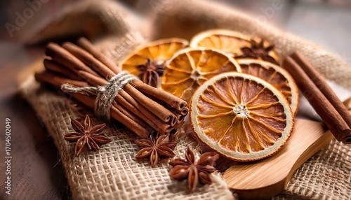 Cozy Arrangement Featuring Burlap Fabric Adorned With Cinnamon Sticks And Orange Slices