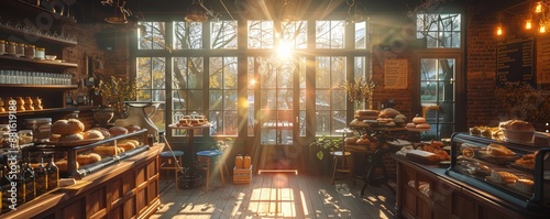 Cozy Artisan Bakery with Sunlight Streaming Through Large Windows and Freshly Baked Goods Displayed