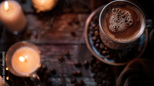 Cozy autumn evening with a steaming cup of coffee, surrounded by candles creating a warm, relaxing atmosphere on a rustic wooden table.