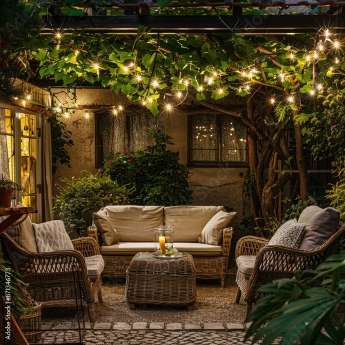 Cozy Backyard Patio with String Lights for Christmas. Warm Garden Outdoor Leisure with Comfortable Furniture, Lush Green Plants, and Relaxed Ambiance for Summer Nights and Team Building Events. AI-Gen