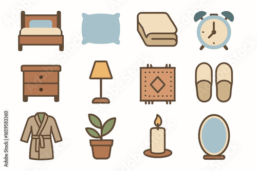 Cozy bedroom essentials icon set featuring furniture and decor elements